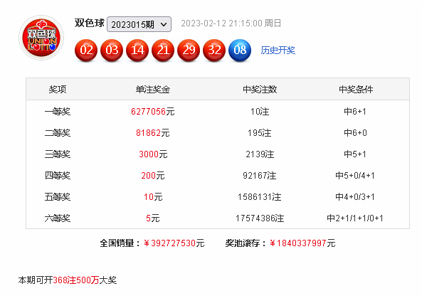 双色球第2023015期开出奖号为02、03、14、21、29、32+08。其中红球号码奇偶比为3:3,三区比为2:2:2,大小比为3:3,蓝球开出偶数号码08。