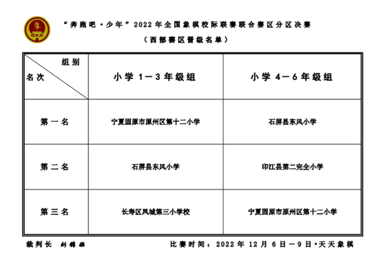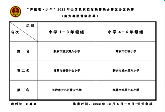 本次赛事幼儿组共比赛7轮,其余组别共比赛5轮,各个赛区褪色幼儿组、中学组,两组录取第又名晋级总决赛,各个赛区小学1-3年龄组、4-6年龄组录取前3名并晋级总决赛。吉林市丰润区第二履行小学校、福鼎市流好意思中心小学、宁夏固原市原州区第十二小学等学校皆以优异得益挺进世界校际联赛总决赛。以下为各赛区晋级名单: